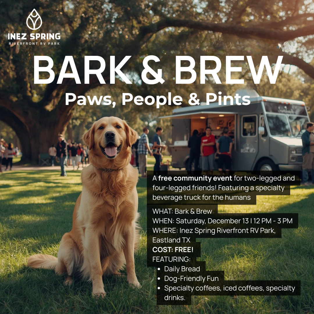 Join us for Bark & Brew, a free community event for dogs and their owners at Inez Spring Riverfront RV Park. Enjoy drinks from Daily Bread Nutrition TX on December 13 from 12-3 PM.